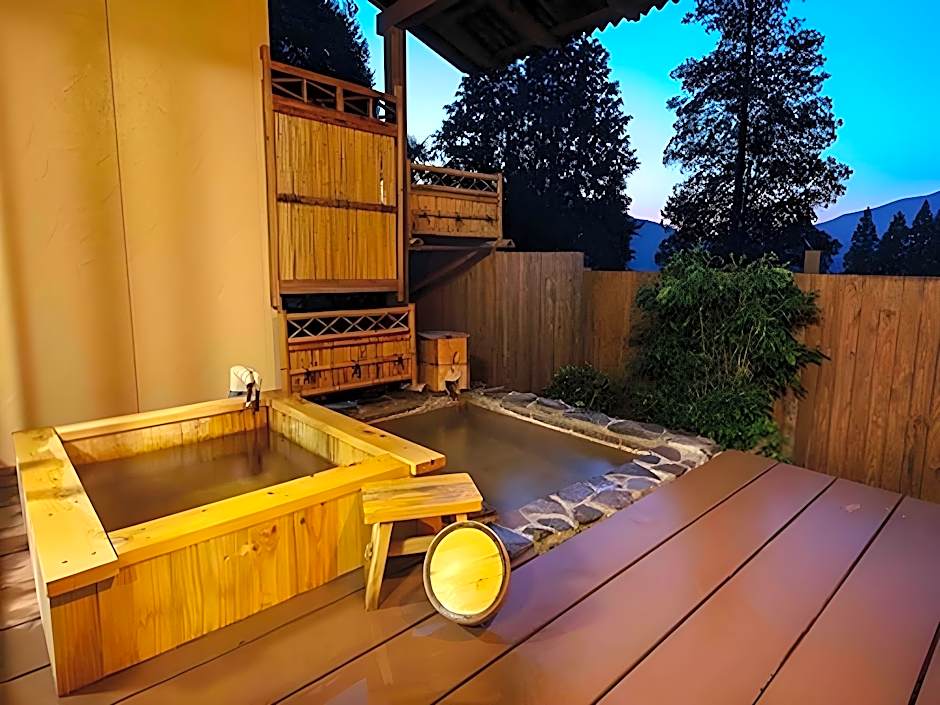 Located on the highest floor of this property, this suite features Okinawan-style tatami (woven-straw) flooring and a built-in TV. The suite features a terrace which surrounds the unit, boasting panoramic views of Moun Yufu and Yufuin. The private bathroom features a bathtub made from Japanese cypress. An open-air bath is also available.